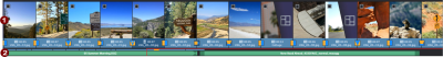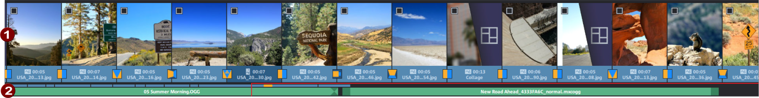Foto-/Videospur Alle Fotos und Videos werden mit Vorschaubildern der Reihe nach in dieser Spur dargestellt. Anhand eines Piktogramms neben der Abspieldauer und eines dunkleren Balkens erkennen Sie auf einen Blick, welche Fotos im Hochformat