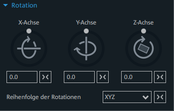 Die Ebene, auf der das Element angeordnet ist, lässt sich um die drei Raumachsen (X, Y, Z) rotieren. Als Zentrum der Rotation dient ebenfalls der Ankerpunkt. Der Rotationswinkel lässt sich direkt über die drei Steuerelemente einstellen oder in Grad ° in den Wertefeldern eingeben. Die eingestellten Rotationen werden nacheinander angewendet. Die dafür verwendete Reihenfolge lässt sich über das Auswahlfeld einstellen. Dies kann in manchen Situationen notwendig sein, wenn man mehr als nur eine Rotation einstellt oder um mehr als nur einer Achse rotieren möchte.