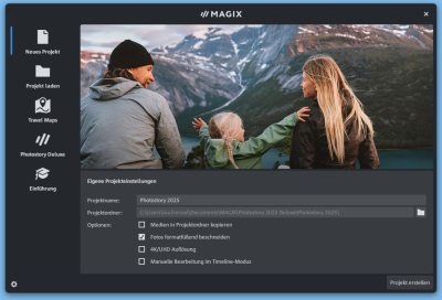 Wenn Sie Photostory deluxe das erste Mal starten, wird ein Startdialog geöffnet. In diesem Dialog können Sie Voreinstellungen für das Projekt festlegen und entscheiden, ob Sie ein neues Projekt erstellen oder ein Projekt laden möchten.