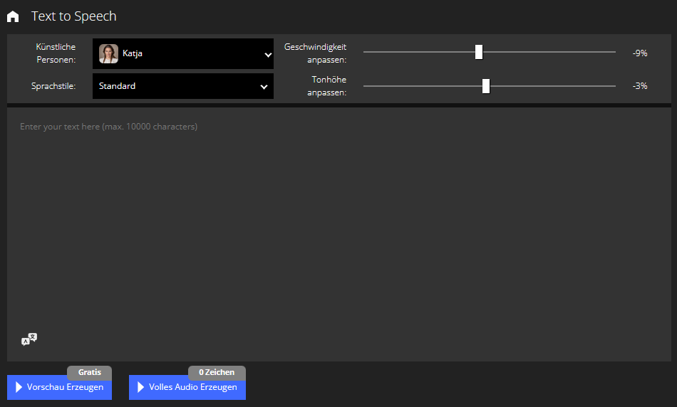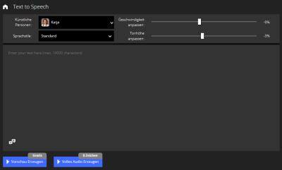 Klicken Sie auf Vorschau Erzeugen, um sich eine Vorschau des generierten Audios anzuhören. Der Text wird umgewandelt und im Anschluss wiedergegeben.