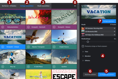 Sie können Ihre angepasste Vorlage speichern und so immer wieder verwenden, ohne erneut Musik, Blenden oder Effekte auswählen zu müssen. Titel und Medienlänge können auch optional übernommen werden. Sobald Sie eine Vorlage gespeichert haben, kann sie in der Vorlagenübersicht (2) ausgewählt werden.