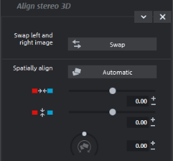 Anaglyph display is recommended for this and can be set in the preview monitor. Precise geometric alignment of images is only possible in this mode.