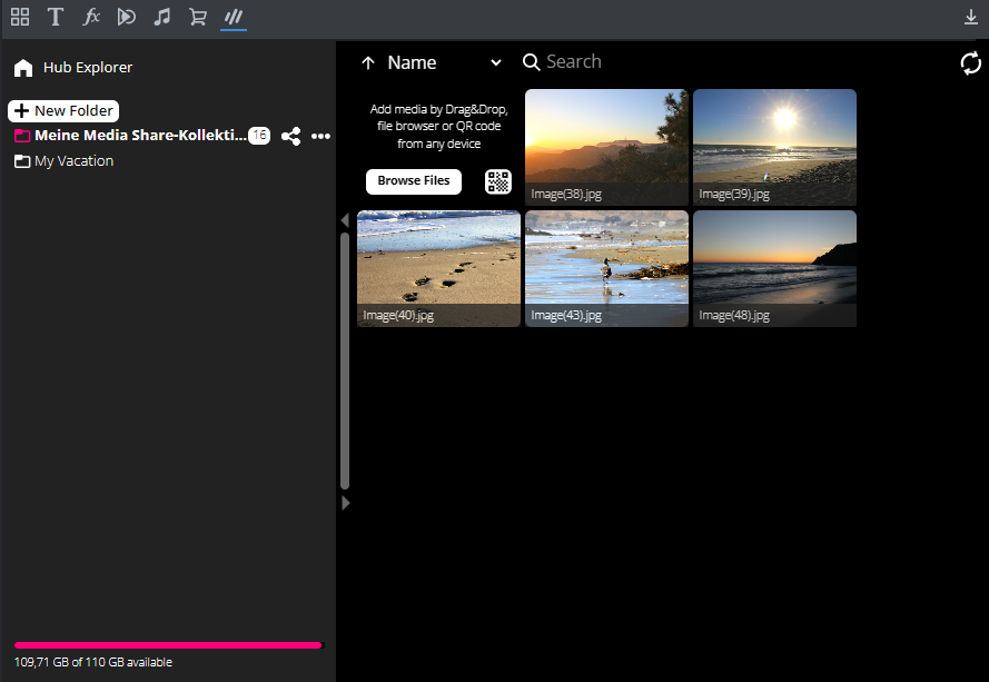 In Hub Explorer, you can easily upload your media to the cloud, regardless of whether it's from your computer or a mobile device. Organize your files in folders and share them with other collaborators. Invite people to view your files or upload files yourself to use them in your projects.