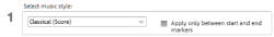 First choose the music style. The option "Apply only between start and end marker" lets you limit the length of the background music you want to create. You can also set the Start and End markers with the left and right mouse button if the Soundtrack Maker is open.