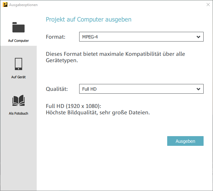 Über die Schaltfläche Ausgeben erreichen Sie den Exportdialog mit den wichtigsten anderen Ausgabemöglichkeiten für Ihre Photostory.