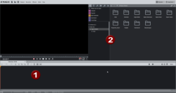 Wanneer een nieuw project wordt gemaakt, verschijnt de programma-interace in de Storyboard-modus en de Arranger (1) is leeg.