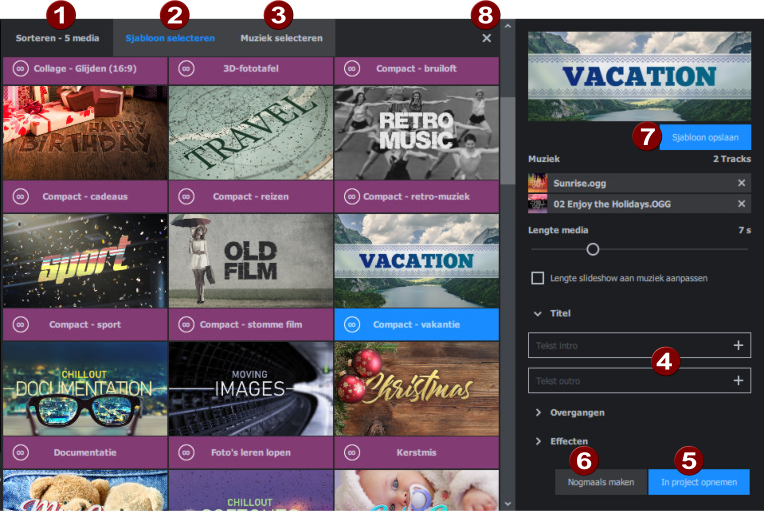U kunt uw aangepaste sjabloon opslaan en steeds opnieuw gebruiken zonder dat u opnieuw muziek, overgangen of effecten hoeft te selecteren. Titel en lengte van de media kunnen ook optioneel worden overgenomen. Zodra u een sjabloon hebt opgeslagen, kan deze worden geselecteerd in het sjabloonoverzicht (2).