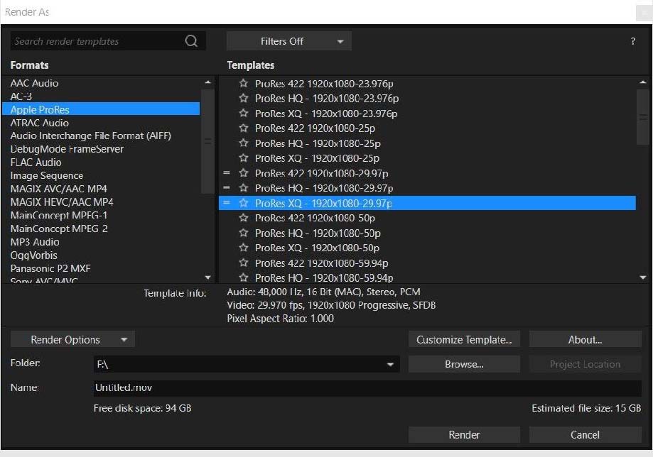 ProRes にレンダリングするには: