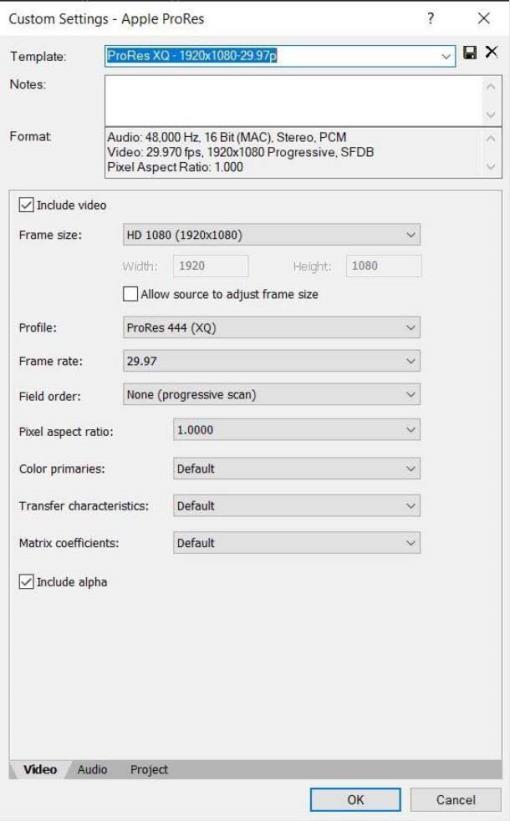 [カスタム設定 -Apple ProRes] ダイアログボックスで、必要なパラメータを設定します。