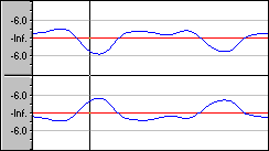 DC オフセットは、サウンド カードなどのハードウェアによって、録音されたオーディオ信号が直流電流の影響を受けるときに発生する。この電流によって、オーディオ信号がサウンド ファイルの正常な -∞ dB(中央の横線)の少し上または下に変化する。DC オフセットの有無を視覚的に確認するには、サウンド ファイルを最大限に拡大表示して、中央の横線から離れている箇所がないかどうかを確認する。以下の例で、赤い線は 0 dB を表します。下の波形は DC オフセットを表している。波形の中心がベースラインから約 2 dB 上にずれている。
