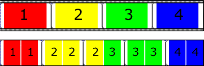 24 fps フィルム(上)と、2-3-3-2 プルダウン フィールドで生成された NTSC ビデオ(下)