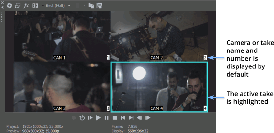 TIP テイクを選択しても、再生は停止されません。マルチカメラ編集モードがアクティブな場合は、再生フレーム レートを維持するために、[ビデオ プレビュー]ウィンドウでビデオ エンベロープ、エフェクト、およびモーションがバイパスされます。