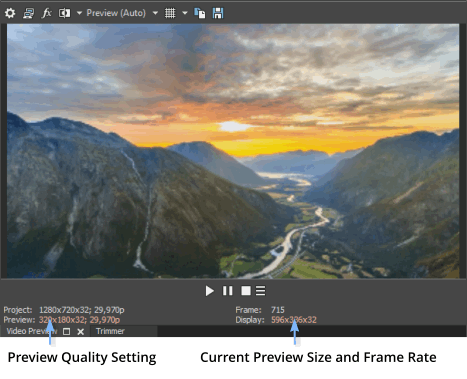 プレビューの現在のフレーム サイズ、カラー ビット深度、およびフレーム レートを表示します。 フルフレームレートでプレビューできない場合は、[ビデオプレビュー品質] 設定の値を小さくするか、ダイナミック RAM プレビューを使用します。