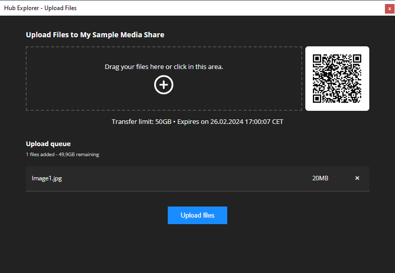 Windows エクスプローラーのフォルダからファイルを Drop Files のターゲットエリアにドラッグします。ファイルがアップロードキューに追加されたことに注視してください。
