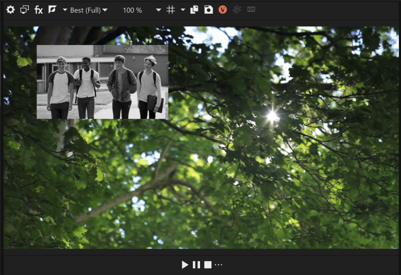 これにより、2 つのビデオのピクチャ イン ピクチャ合成が作成され、両方とも白黒で表示されます。