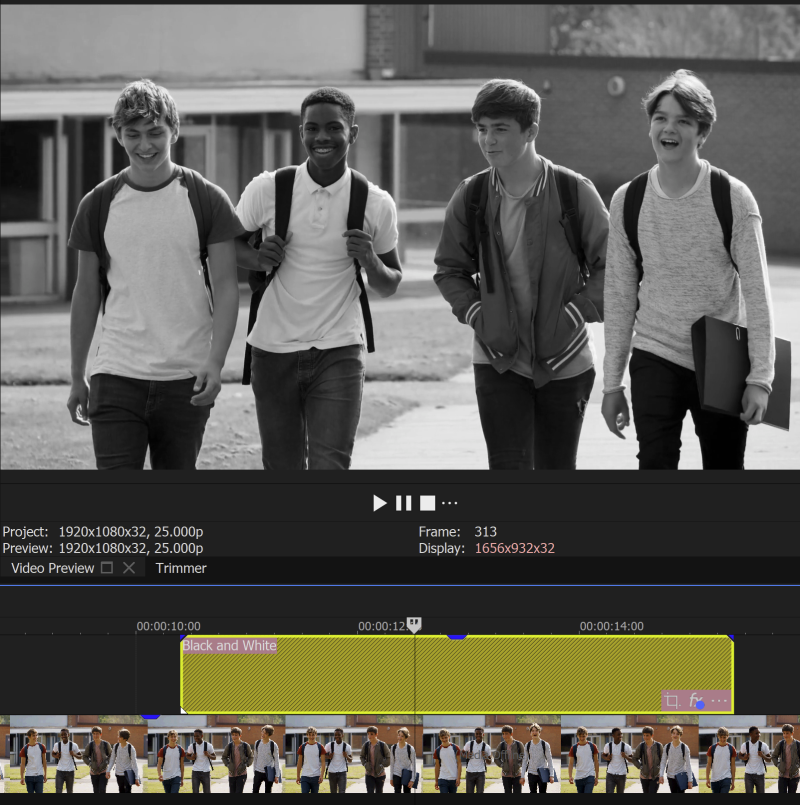 EXAMPLE たとえば、調整イベントの下のビデオがカラークリップであると仮定すると、エフェクトのリストから白黒を選択します。