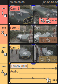 マルチテイク イベントを同期させたら、マルチカメラ編集モードを使用してテイクを選択したり、カメラを切り替えたりできます。この操作はVEGAS Pro が 特定のタイムコードやビート マーカーなどの正確に一致しているポイントで 一時停止している間に実行できます。また、再生中に実行することも できます。