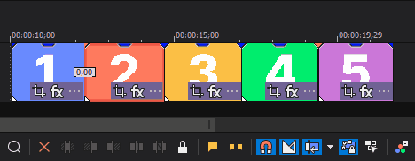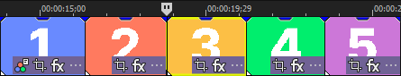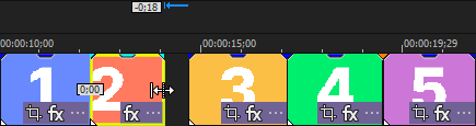 選択したオプションに従って、編集後にタイムラインの内容がリップルされます。次の例では、ポスト編集リップルによって、2 つめと 3 つめのイベントの間のスペースが閉じられます。