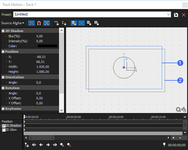 キーフレーム コントローラで、[2D シャドウ] 行を選択します。[2D シャドウ] 行が選択された際、シャドウ コントロールが[トラック モーション]ダイアログ ボックスに表示されます。