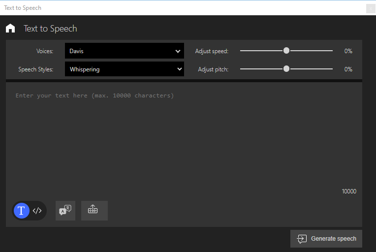 [Text to Speech] ダイアログボックスで、音声に変換するテキストをテキストフィールドに入力します。
