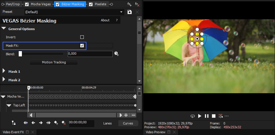 [マスクの作成...] ボタンをクリックして [ベジェマスキング] プラグインを FX チェーンに追加し、Mocha で作成したトラッキングマスクと一致するマスクを VEGAS Pro で作成します。[ビデオプレビュー] ウィンドウで、マスクが適用されたことがわかります。
