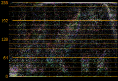 [ビデオ スコープ] ウィンドウの RGB パレード モニタには、ビデオ信号の赤、緑、青コンポーネントの波形が表示されます。モニタは RGB 値を 0~255 の範囲でプロットします。