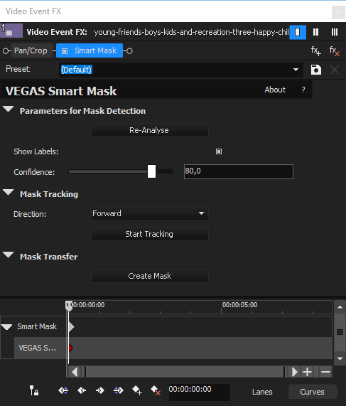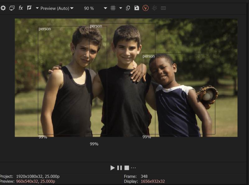 このプラグインはビデオフレームを分析し、人工知能テクノロジーを使用して、マスクを生成できるフレーム内のオブジェクトを識別します。許容される信頼性レベルを下回るオブジェクトをフィルターで除外できます。ツールがマスクを作成するオブジェクトを識別すると、ツールは、マスクがすでに配置されているベジェマスキング プラグインを FX チェーンに追加します。その後、必要に応じて新しいマスクを完全に調整できます。
