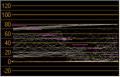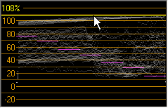 [ビデオ スコープ] ウィンドウの波形モニタで、ビデオ信号の輝度値 (明るさまたは Y コンポーネント) をモニタできます。モニタは垂直軸で輝度値を、水平軸で現在のフレーム幅をプロットします。