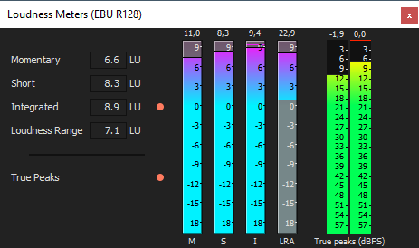 メーターのモードを変更するには、[オプション] | [ラウドネス メーター]を選択し、サブメニューから[EBU R 128 モード]または[ATSC A 85 モード]を選択します(メーターを右クリックしてオプションを設定することもできます)。