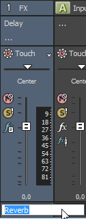 割り当て可能なエフェクト チェーンの名前を変更するには、チャンネル ストリップの下部にあるラベルをダブルクリックして、新しい名前をボックスに入力します(または、[F2]キーを押して、選択した割り当て可能なエフェクト チェーンの名前を変更します)。[Enter]キーを押すと、ミキシング コンソールのチャンネル ストリップが更新されます。
