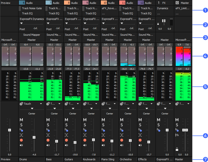 オーディオ トラック、バス、入力バス、および割り当て可能なエフェクト チェーンは、ミキシング コンソールではチャンネル ストリップとして表示されます。