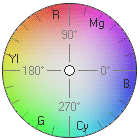 Los colores complementarios son aquéllos que se encuentran a 180 grados en la rueda. En la siguiente imagen puede observar que el rojo y el cian son colores complementarios, al igual que el fucsia y el verde o el azul y el amarillo.