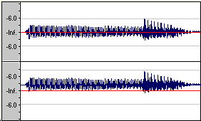 El desplazamiento de CC se produce cuando un hardware, como una tarjeta de sonido, agrega corriente continua a una señal de audio grabada. Esta corriente provoca que la señal de audio alterne alrededor de un punto por encima o por debajo de la línea normal -infinitos dB (centro) en el archivo de sonido.Para comprobar visualmente si existe un desplazamiento de CC, puede hacer zoom a lo largo de todo un archivo de sonido y ver si parece flotar sobre la línea de centro.