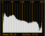 Contraste disminuido con un centro de contraste de 0,5: el histograma se ajusta a una franja más estrecha del espectro delimitada a partir del centro de la gráfica.