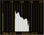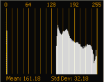 Contraste disminuido con un centro de contraste de 1,0: el histograma se ajusta a una franja más estrecha del espectro delimitada al extremo derecho de la gráfica.
