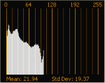 Contraste disminuido con un centro de contraste de 0,0: el histograma se ajusta a una franja más estrecha del espectro delimitada al extremo izquierdo de la gráfica.