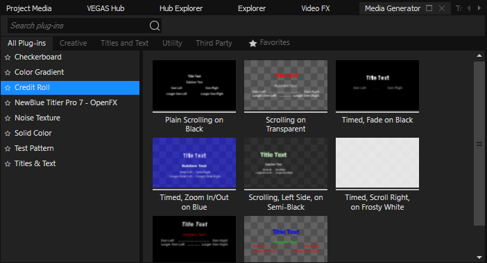 Encontrará los Generadores de medios disponibles en la parte superior de la ventana, organizados por categorías. Además de las categorías más comunes como Gráficos Creativos, Texto y títulos o Utilidades, existen también tres categorías especiales: