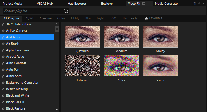 Encontrará los efectos de vídeo disponibles en la parte superior de la ventana, organizados por categorías. Además de las categorías más comunes como Color, Luminosidad o Utilidades, existen también tres categorías especiales:
