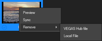 Haga clic con el botón derecho del ratón en un archivo y seleccione Sincronizar en el menú contextual. De esta forma, se descargará el archivo en su unidad local. Al finalizar la descarga, el archivo tendrá una marca de verificación que indica que existe tanto en su almacenamiento en la nube como en su unidad local. Ahora que el archivo se ha guardado localmente, puede utilizar cualquiera de los métodos normales para añadirlo a su escala de tiempo de VEGAS Pro y trabajar con él.