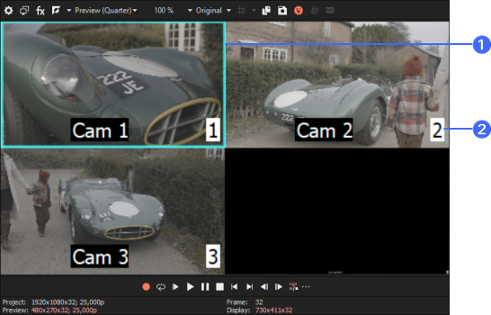 Existen varios métodos que puede usar para seleccionar tomas, como pulsar las teclas numéricas o hacer clic en las tomas en la ventana de vista previa de vídeo. Al seleccionar una toma, VEGAS Pro cambia la toma activa por el evento multicámara.
