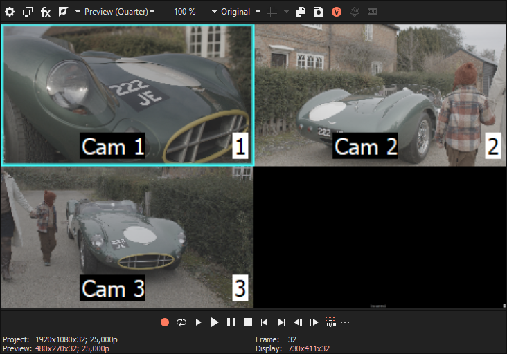 VEGAS Pro puede obtener una vista previa de varias tomas al mismo tiempo en el modo multicámara, pero el rendimiento del ordenador condicionará la velocidad de fotogramas de la reproducción.