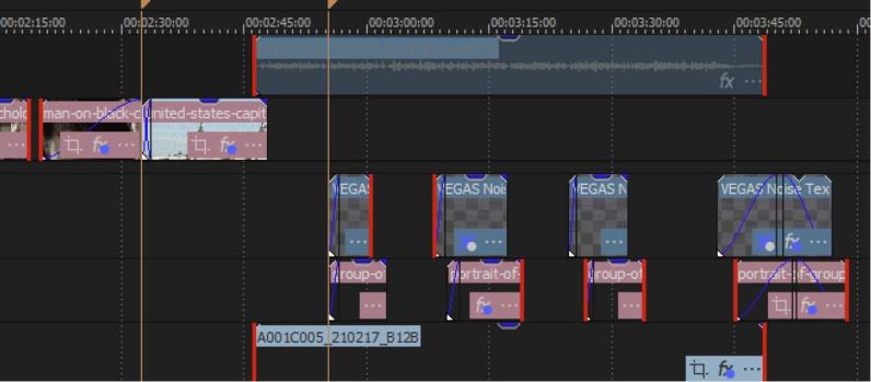 Este indicador aparecerá en cualquier borde de evento no cuantizado, ya sea izquierdo o derecho, e independientemente de si el evento contiene vídeo o audio. No debe preocuparse demasiado por los bordes no cuantizados de los eventos de audio, a menos que esos bordes correspondan a un evento de vídeo asociado. La cuantización de fotogramas no tiene ningún beneficio para los eventos de audio y, de hecho, VEGAS Pro ignora esta cuantización para cualquier edición que sea solo de audio, pero seguirá identificando los bordes de los eventos de audio que no estén cuantizados.