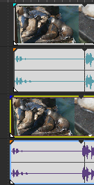 Añada el medio a la escala de tiempo con el modo Añadir a lo largo de las pistas para que el vídeo de los ojos izquierdo y derecho esté en pistas separadas. En el siguiente ejemplo, la pista del ojo izquierdo está por encima de la del ojo derecho.