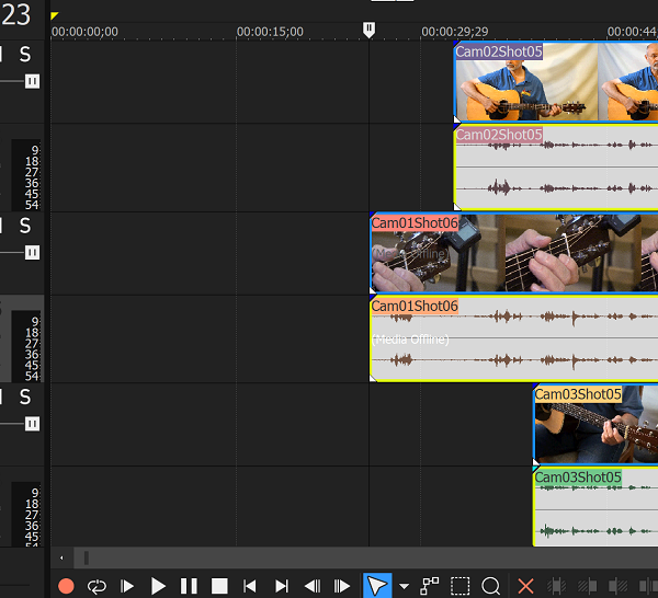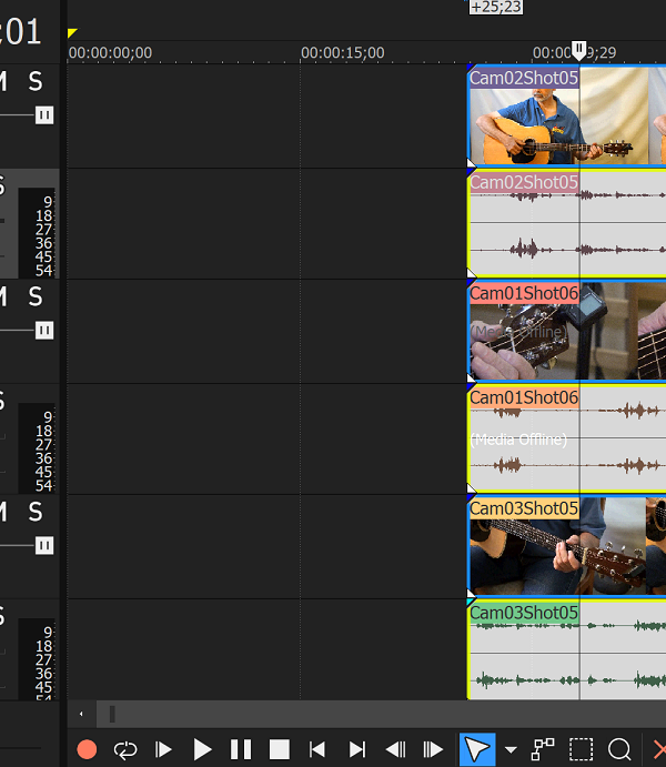 Para poder editar de manera eficaz el metraje multicámara en VEGAS Pro, debe tener los clips de vídeo sincronizados. El mejor lugar para esto es la escala de tiempo, usando las mismas herramientas de edición de VEGAS Pro que emplearía para cualquier proyecto de vídeo.