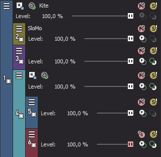 El movimiento de pista primario se aplica tanto a la pista primaria como a las secundarias. En la lista de pistas de muestra, el movimiento de la pista primaria en la pista 1 afectará de las pistas 1 a 6. El movimiento de la pista primaria aplicado a la pista 4 sólo afectará de las pistas 4 a 6. |