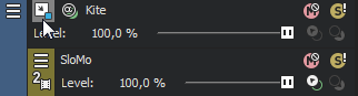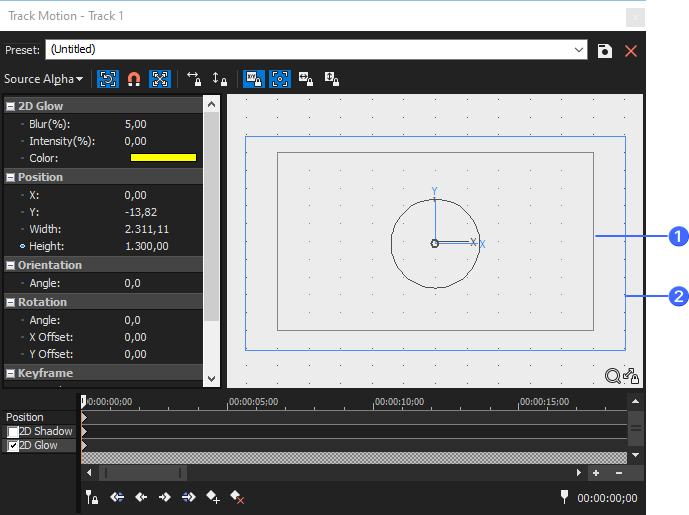 Seleccione la fila Resplandor 2D en el controlador de fotogramas clave. Cuando la fila Resplandor 2D se encuentra seleccionada, los controles de brillo se muestran en el cuadro de diálogo Movimiento de pista.