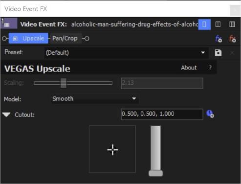 Al utilizar el efecto Upscale de VEGAS como efecto de evento de vídeo, el plug-in Upscale aumentará automáticamente la resolución del vídeo a la resolución del proyecto definida en Configuración de proyecto, por lo que este control deslizante permanecerá inactivo, ya que no lo necesita. Sin embargo, sí que le indica el valor del ajuste automático, como puede ver en la imagen.