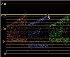 El monitor de formación RGB de la ventana de campos de vídeo muestra formas de onda para los componentes rojo, verde y azul de la señal de vídeo. El monitor traza los valores RGB de 0 a 255.