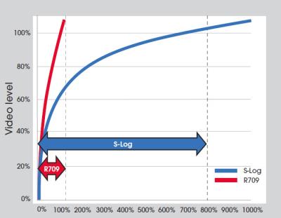 Con el fin de capturar el rango dinámico completo que puede conseguir la cámara, Sony ha desarrollado el sistema de codificación de registro S; este sistema adapta los valores de codificación de píxeles mediante una curva logarítmica para capturar un rango dinámico mayor. Como se muestra en el gráfico que aparece a continuación, el registro S captura muchas más paradas que la codificación de vídeo típica: