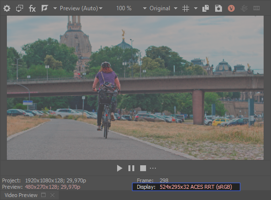 Cuando abra la codificación del registro S en el denominado espacio de color lineal de escena, no podrá verla directamente en una pantalla estándar. Deberá ejecutarla mediante una transformación de renderización de referencia (RRT) que comprima el rango dinámico y atenúe los altos y los bajos. La RRT ACES se ha concebido para ser apta para películas. Cuando establecemos este medio de origen en el espacio de color registro S1 de Sony (F35/F3) y lo visualizamos mediante la RRT ACES, inicialmente se verá de esta forma que es bastante más oscura que en el vídeo normal:
